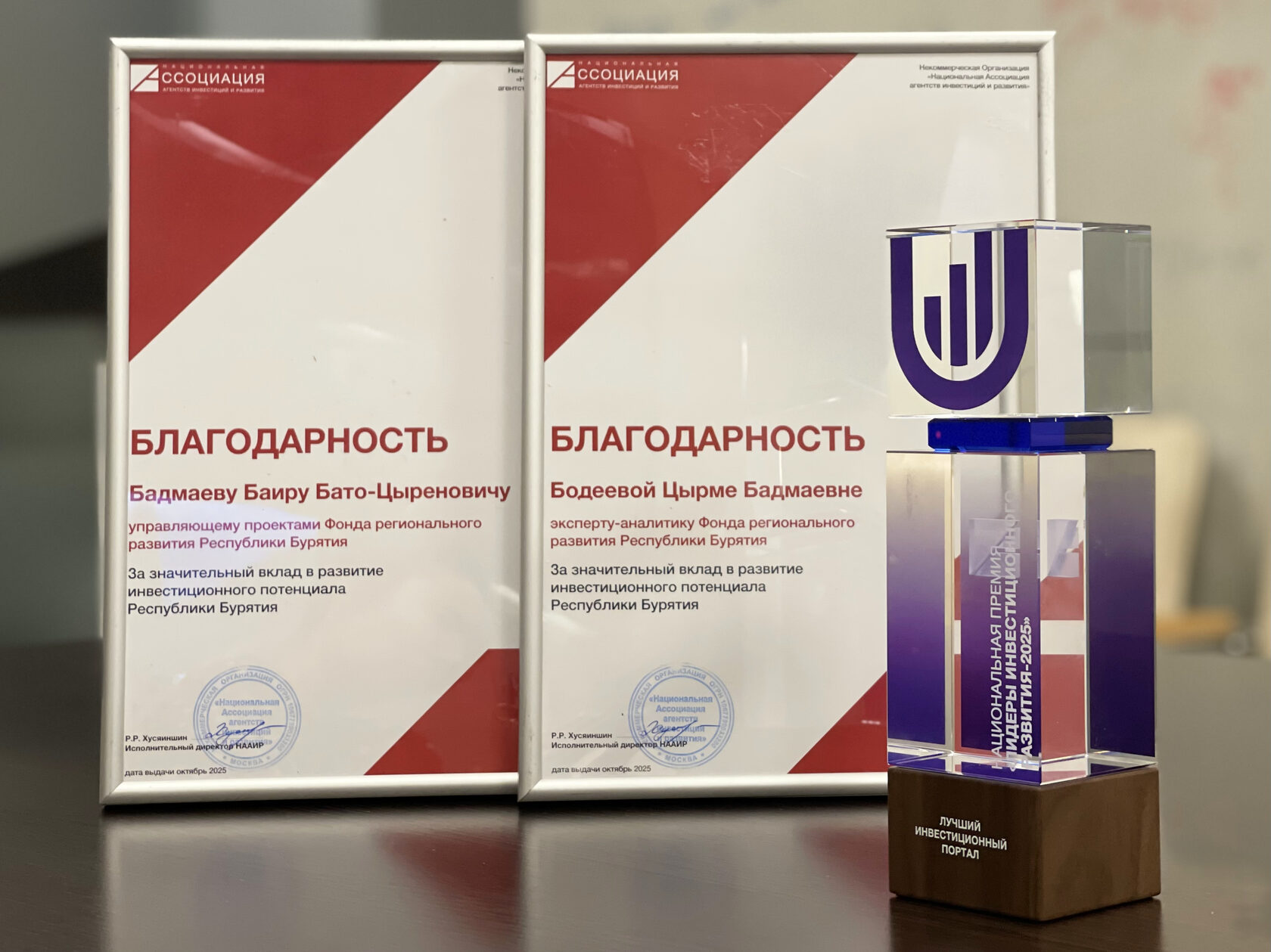 На церемонии управляющие проектами Фонда регионального развития Бурятии Баир Бадмаев и Цырма Бодеева отмечены благодарностями за значительный вклад в развитие инвестиционного потенциала Республики.